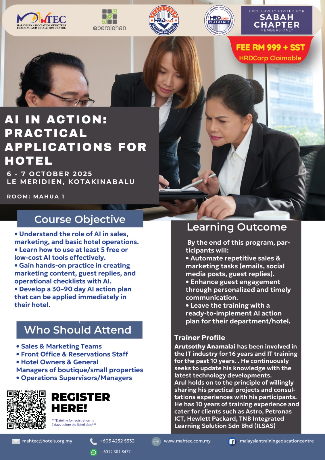 The success of this pilot programme demonstrates MAH Sabah Chapter’s commitment to equipping its members with relevant digital and leadership competencies in an evolving hospitality landscape. It also underscores the Chapter’s forward-thinking vision in embracing AI-driven innovation as part of the broader transformation of Malaysia’s hotel industry.