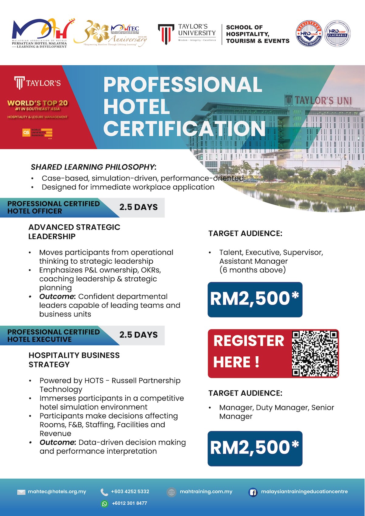 The Professional Hotel Certification Programme, jointly developed by the Malaysian Association of Hotels (MAH) and Taylor’s University, is an industry-led leadership development series designed to equip hospitality professionals with strategic, commercial and operational capabilities for today’s hotel environment. Delivered through case-based learning and immersive simulations, the programme enables immediate workplace application while developing confident leaders capable of driving performance and sustainable growth.
