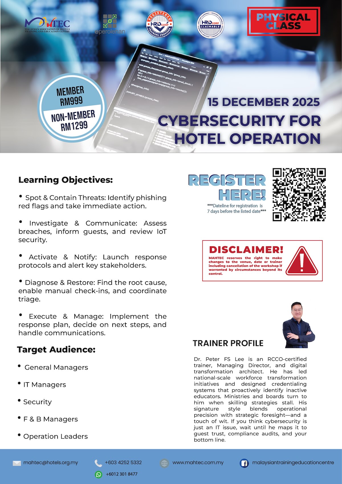 As hotels increasingly rely on digital systems, AI, and IoT to enhance guest experiences, the risk of cyberattacks continues to grow. This 2-day program equips hotel leaders with the knowledge to identify, assess, and respond to cybersecurity threats while fostering a culture of vigilance. Participants will learn to address industry-specific risks, implement effective security protocols, adapt to evolving technologies, and align strategies with data protection and compliance laws—ensuring safe, seamless operations for both guests and the business.