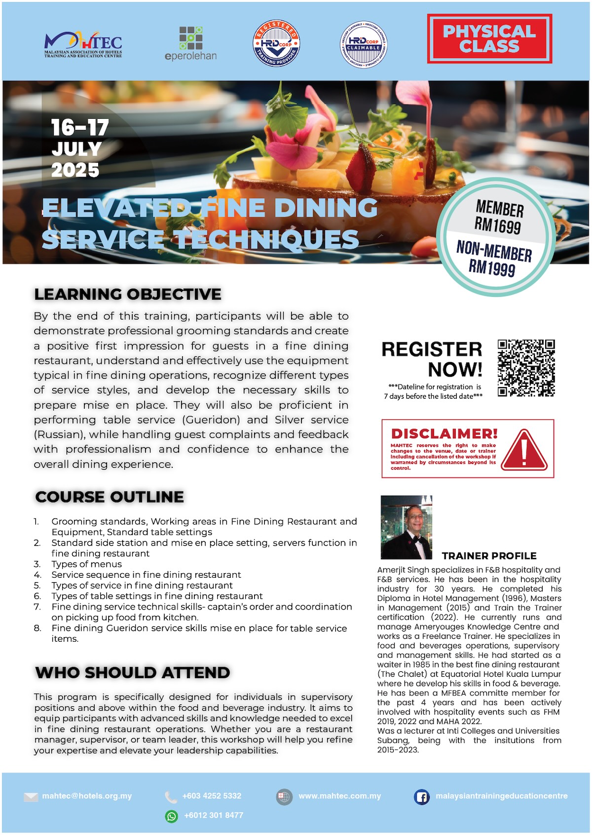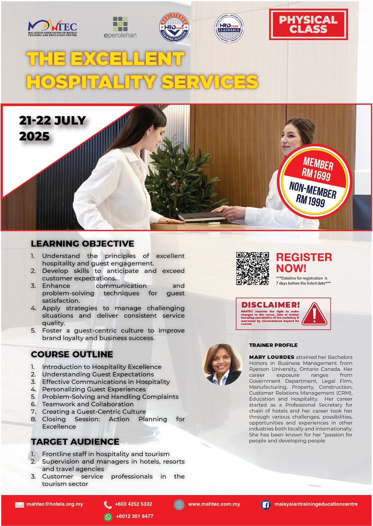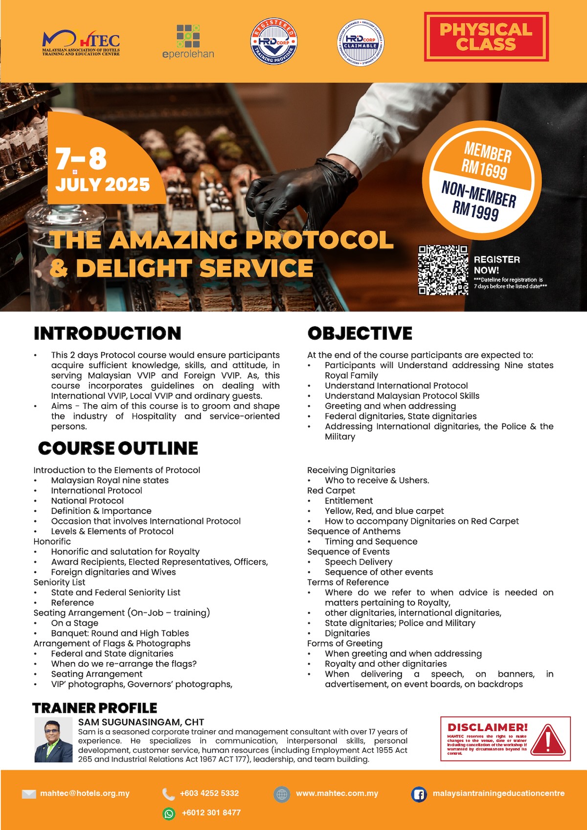 These 2 days protocol course would ensure participants acquire sufficient knowledge, skills and attitude, in serving Malaysian VVIP and Foreign VVIP. As, this course incorporates guidelines on dealing with International VVIP, local VVIP and ordinary guests. The aim of this course is to groom and shape the industry of hospitality and service -oriented persons.