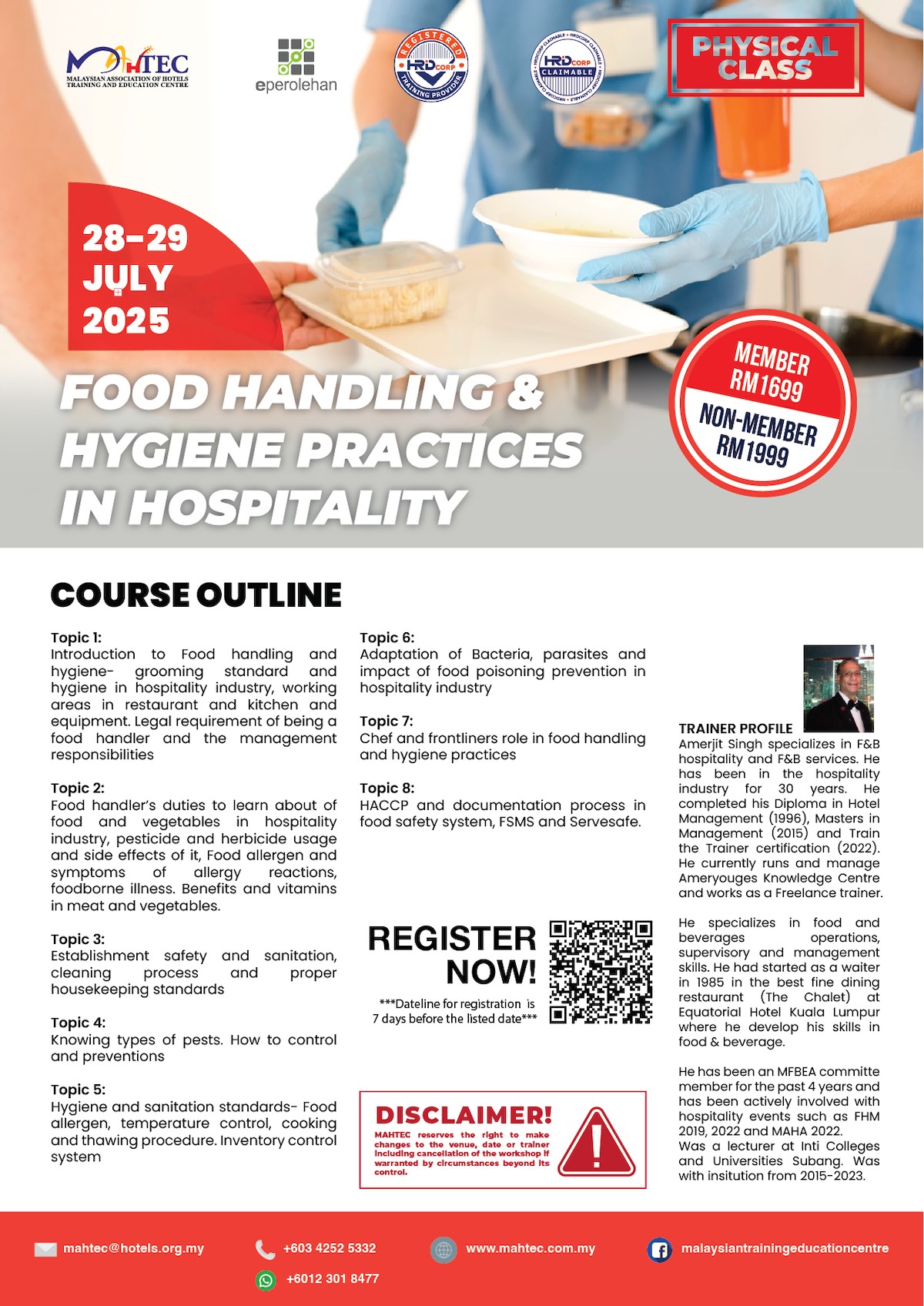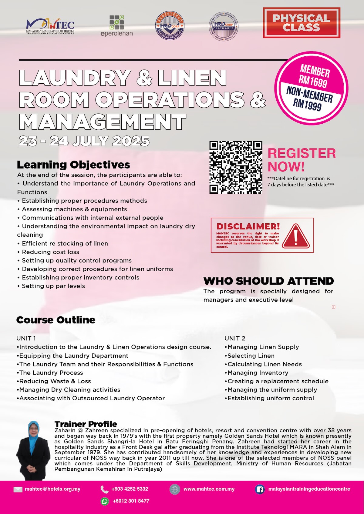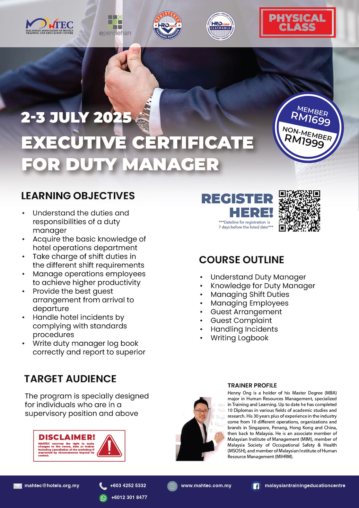 These 2 days protocol course would ensure participants acquire sufficient knowledge, skills and attitude, in serving Malaysian VVIP and Foreign VVIP. As, this course incorporates guidelines on dealing with International VVIP, local VVIP and ordinary guests. The aim of this course is to groom and shape the industry of hospitality and service -oriented persons.
