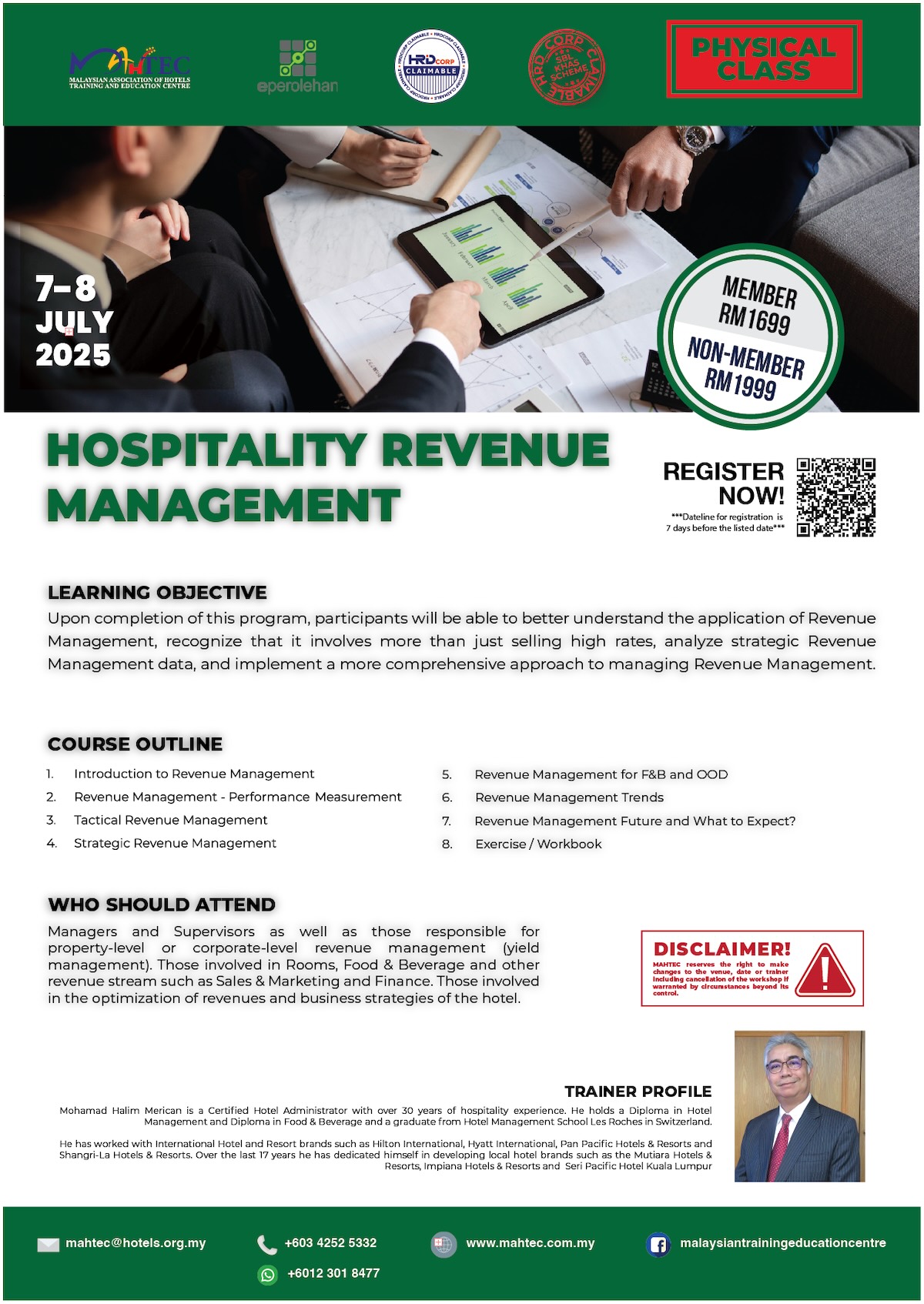 Upon completion of this program, participants will be able to better understand the application of Revenue Management, recognise that it involves more than just selling high rates, analyse strategic Revenue Management data, and implement a more comprehensive approach to managing Revenue Management